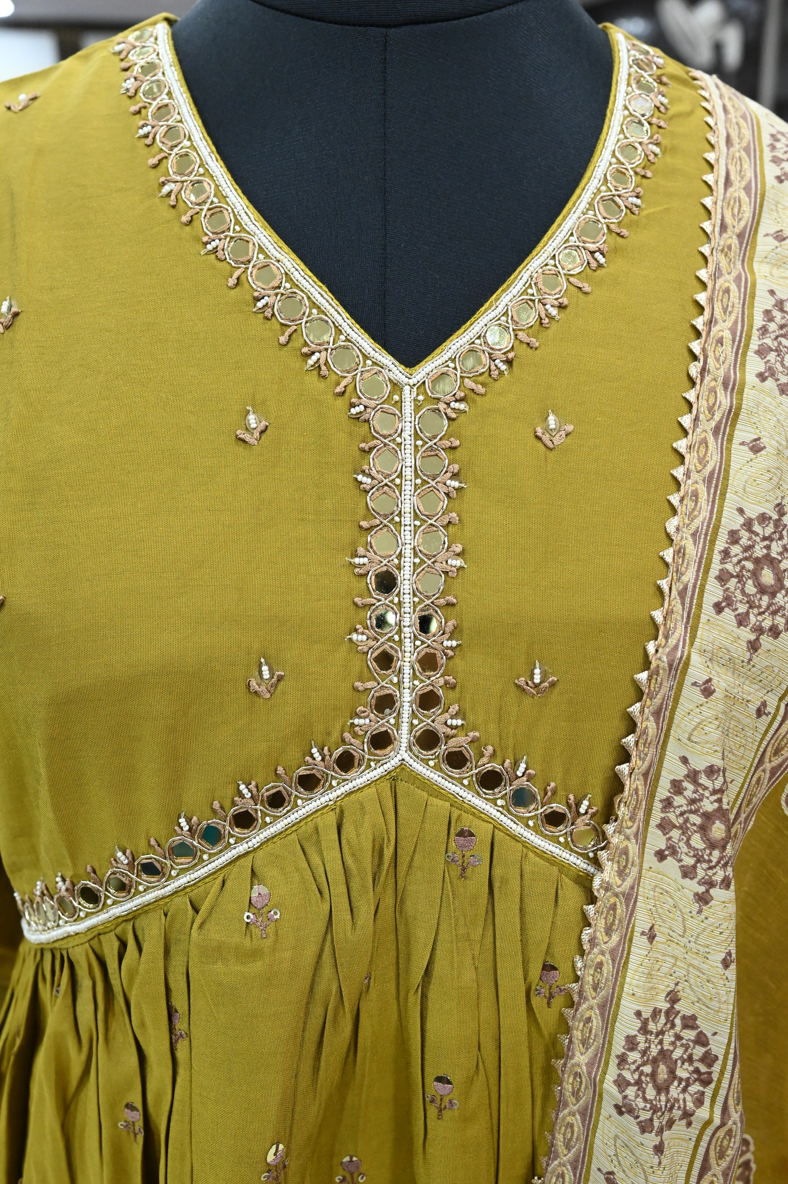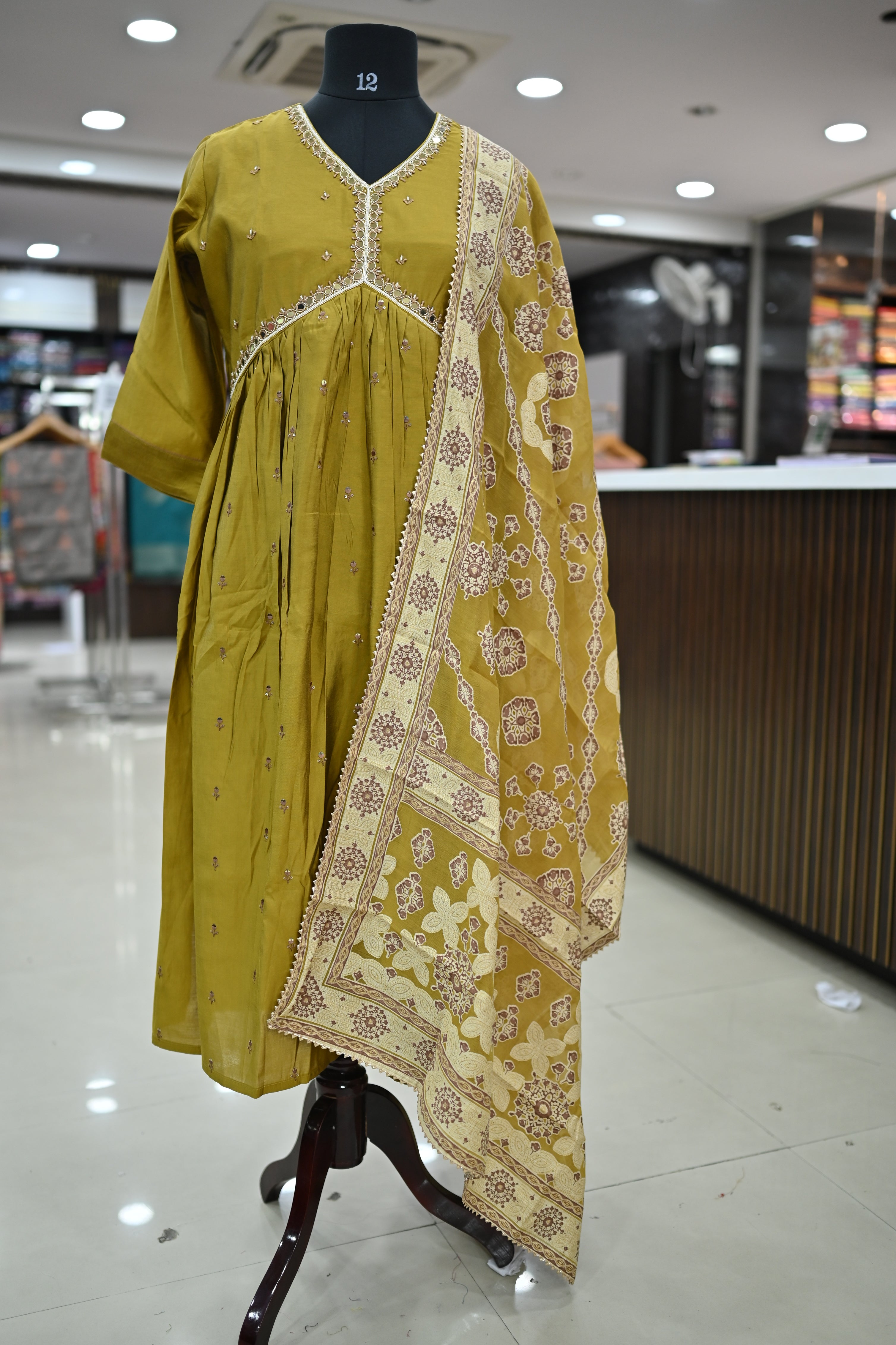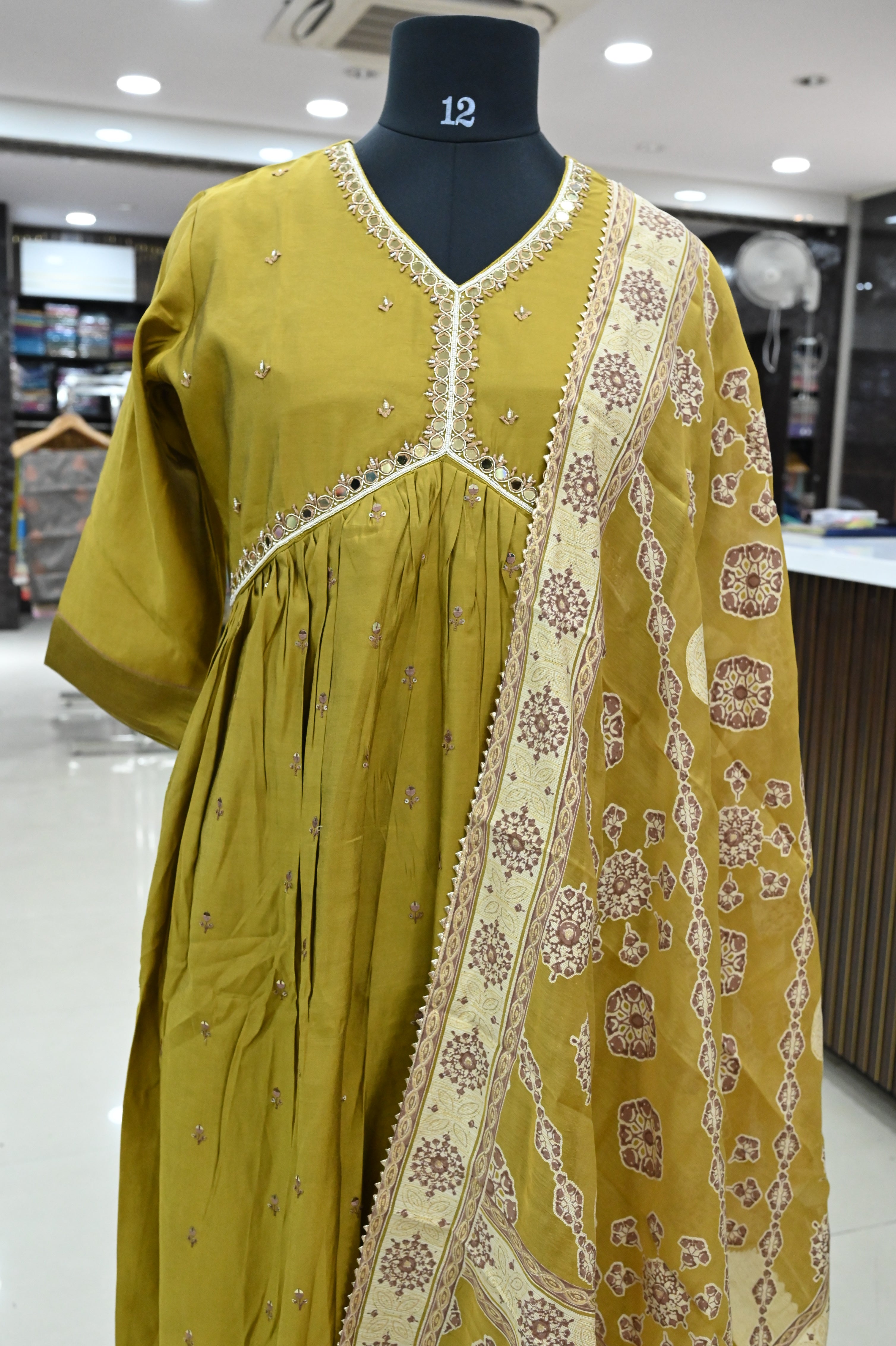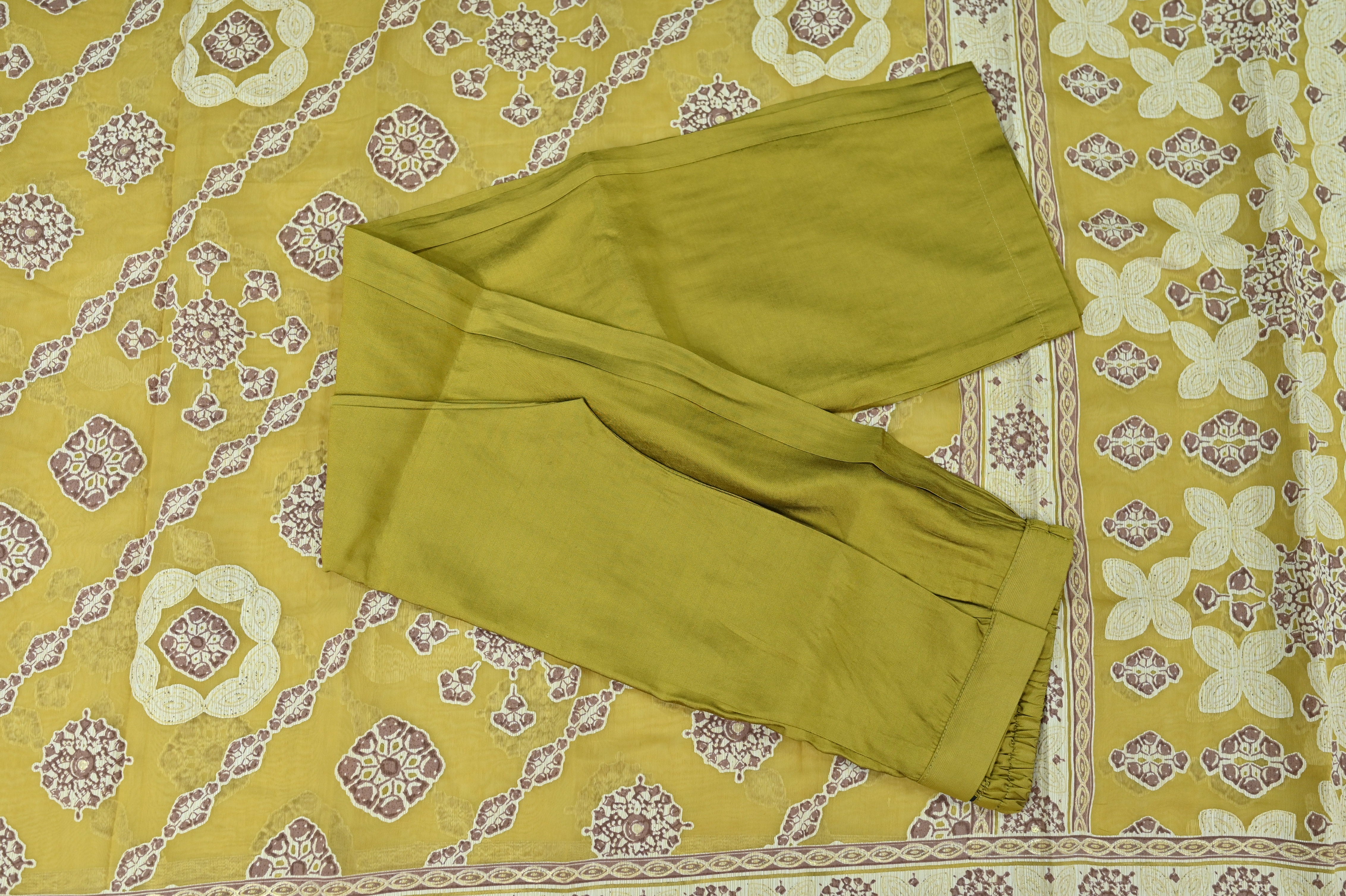 A V-neck muslin silk kurta set typically includes a kurta (tunic), pants, and a dupatta (scarf). This set features a straight cut design and is made from luxurious muslin silk fabric.