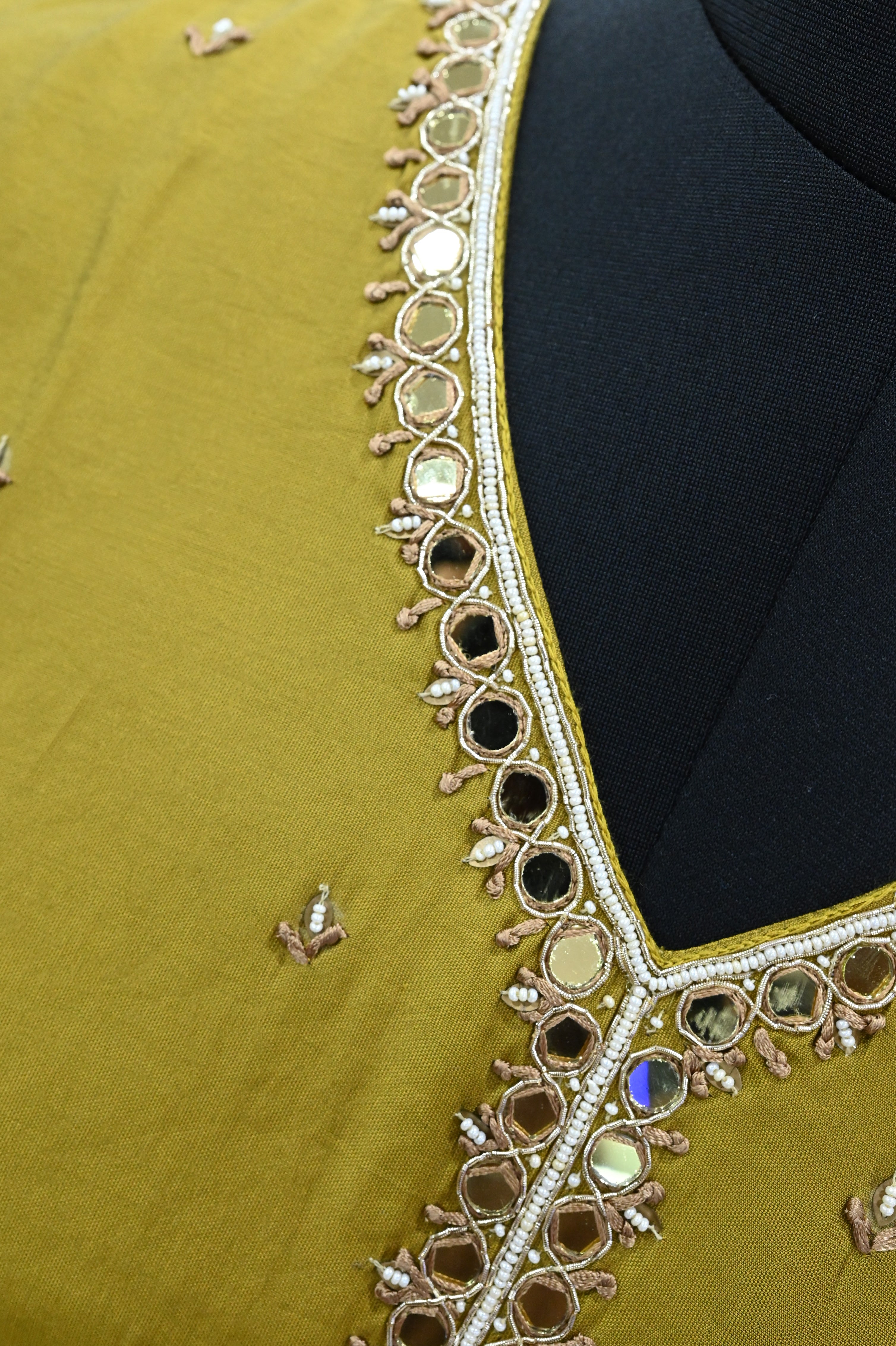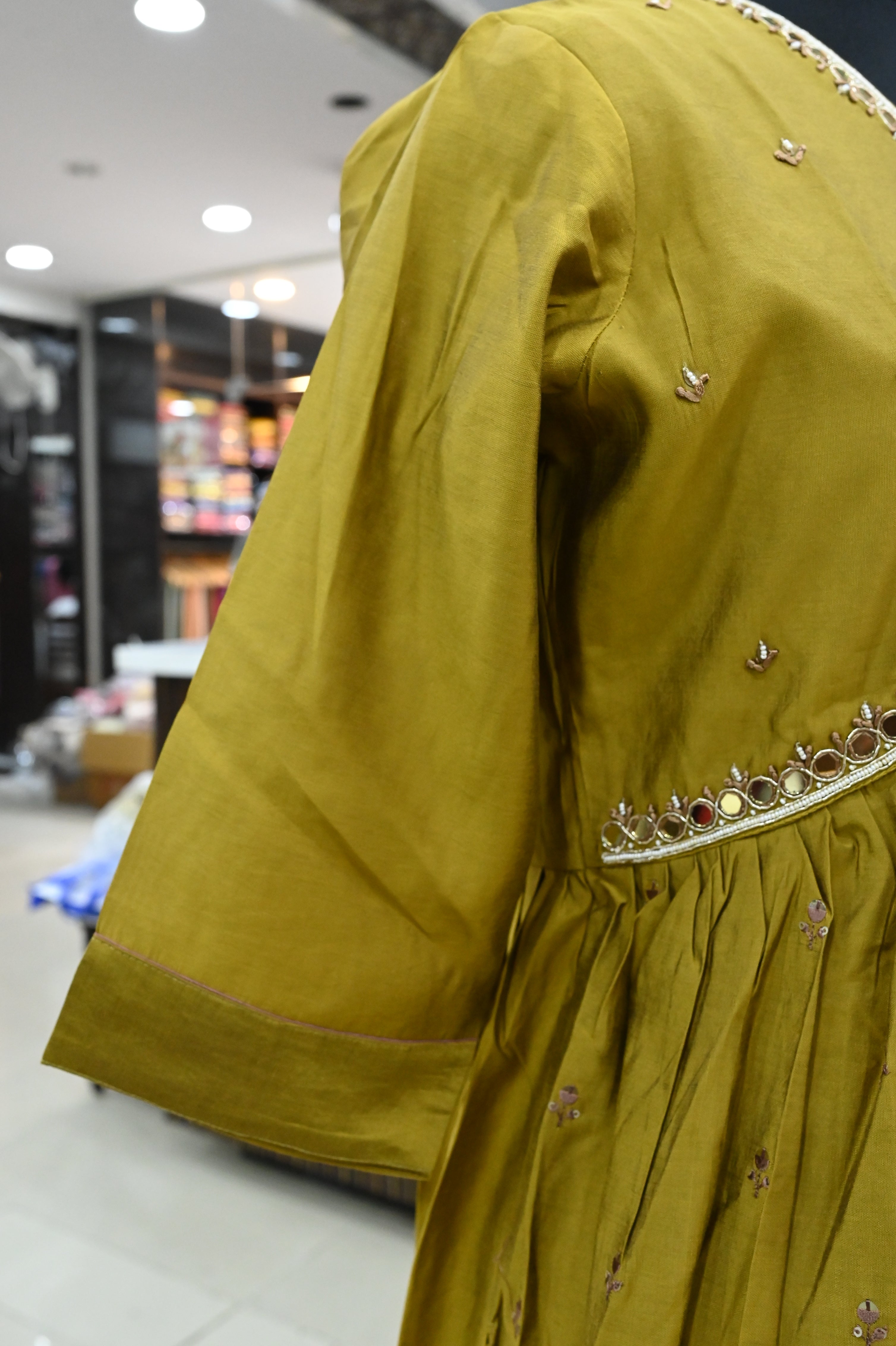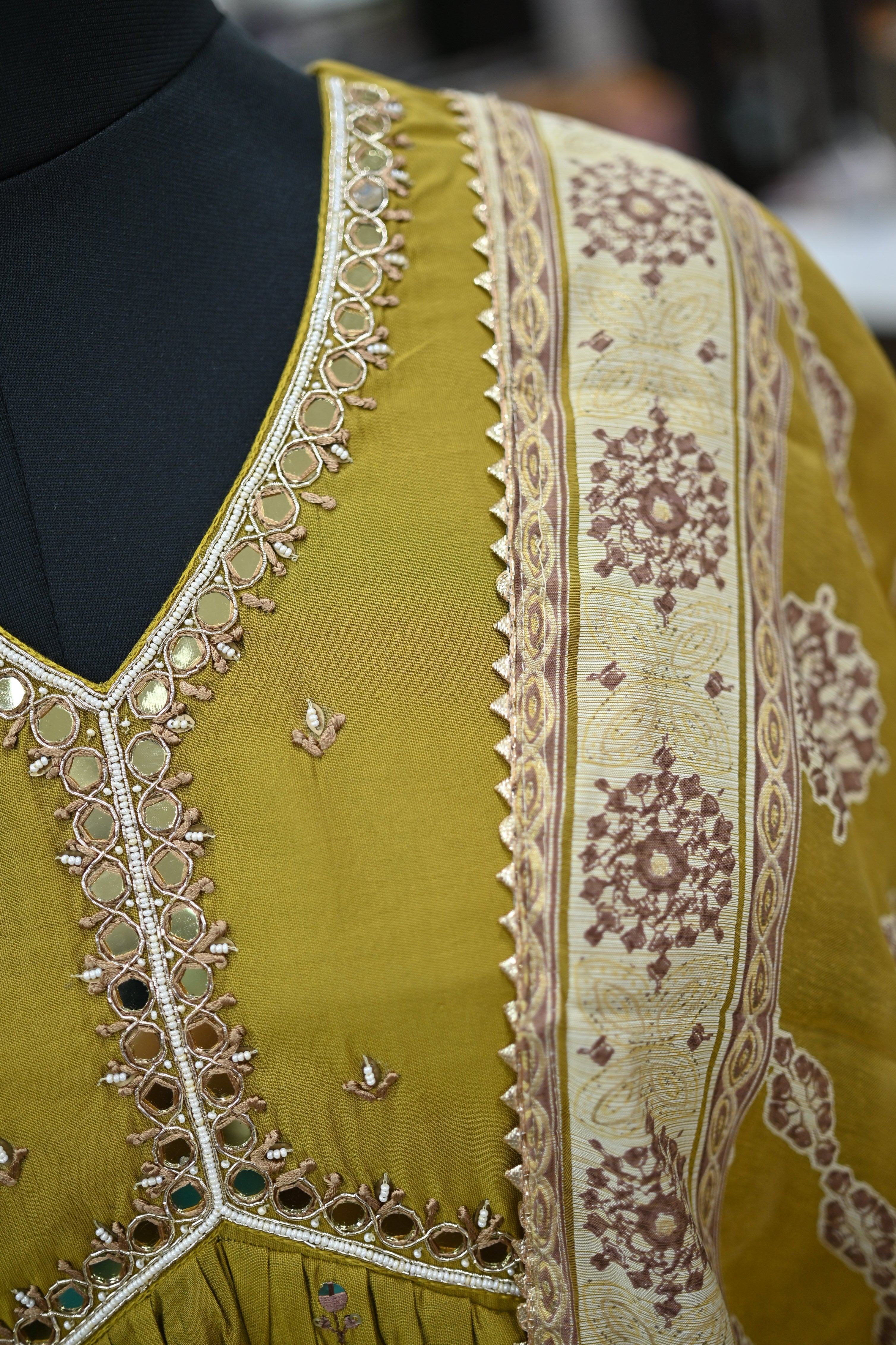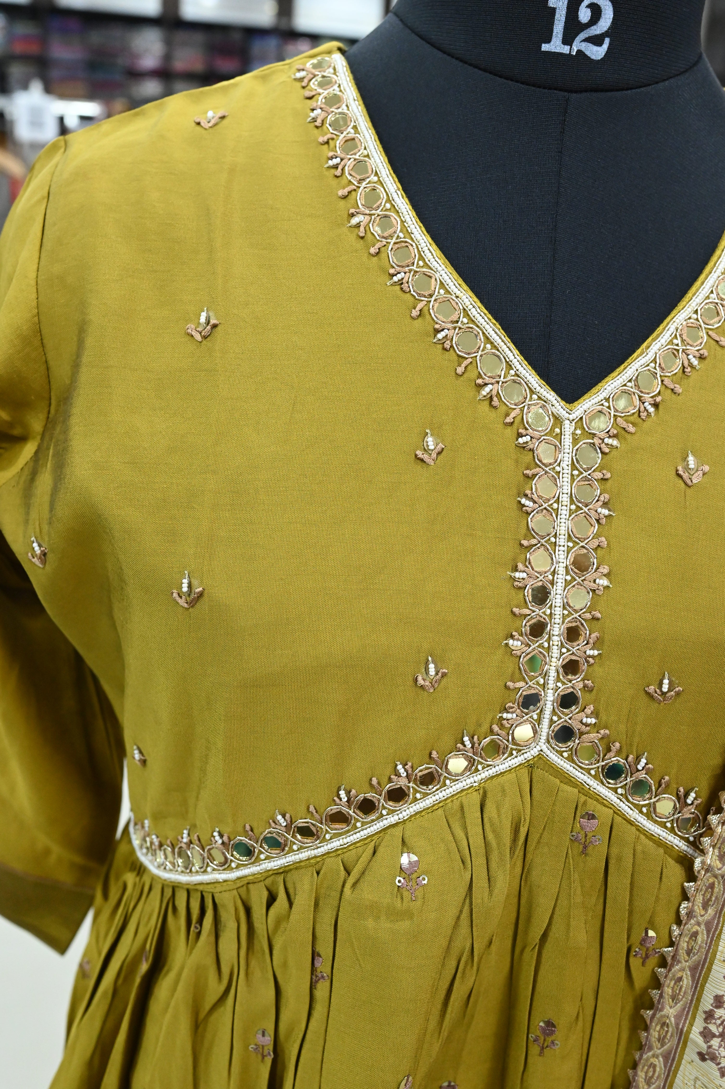A V-neck muslin silk kurta set typically includes a kurta (tunic), pants, and a dupatta (scarf). This set features a straight cut design and is made from luxurious muslin silk fabric.