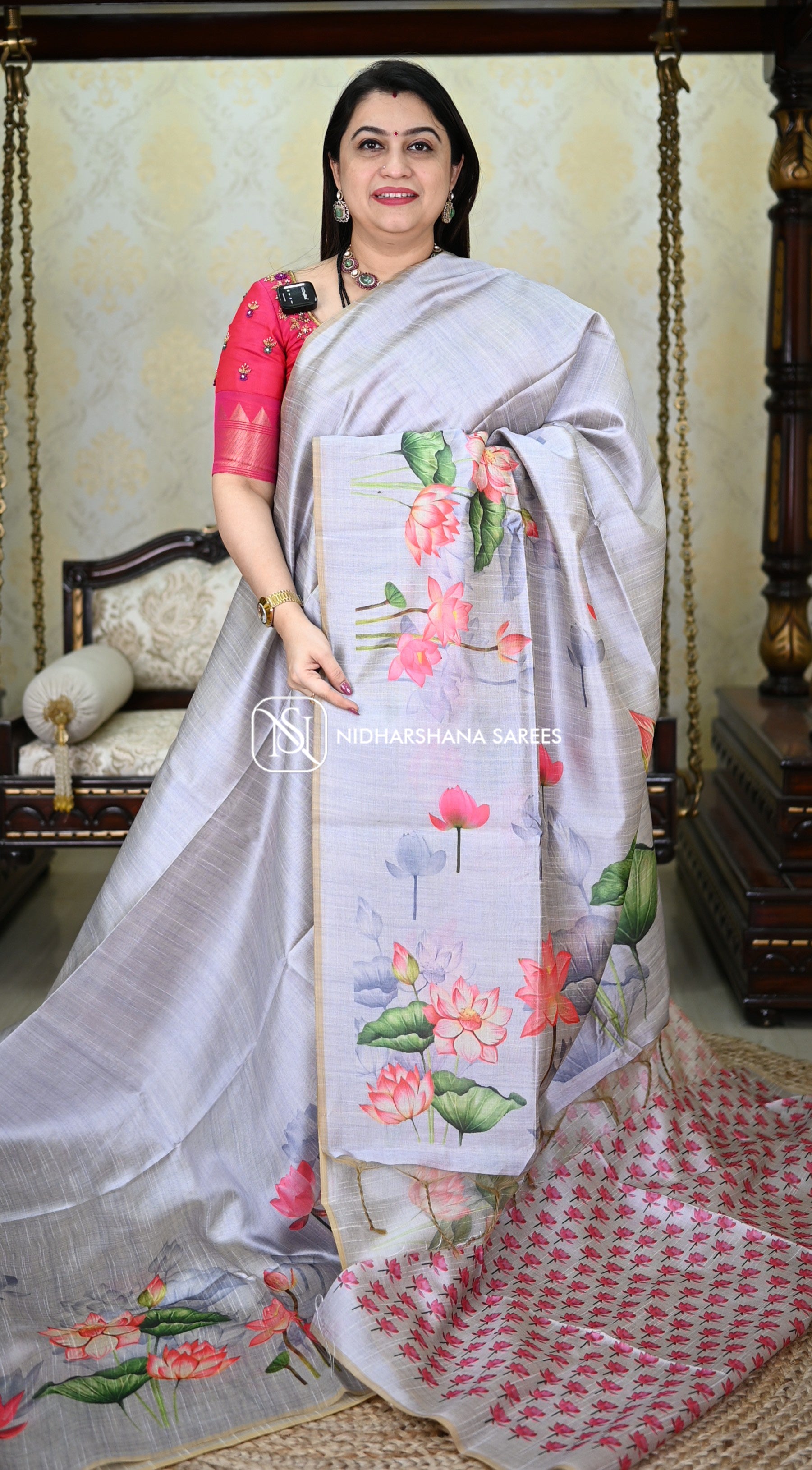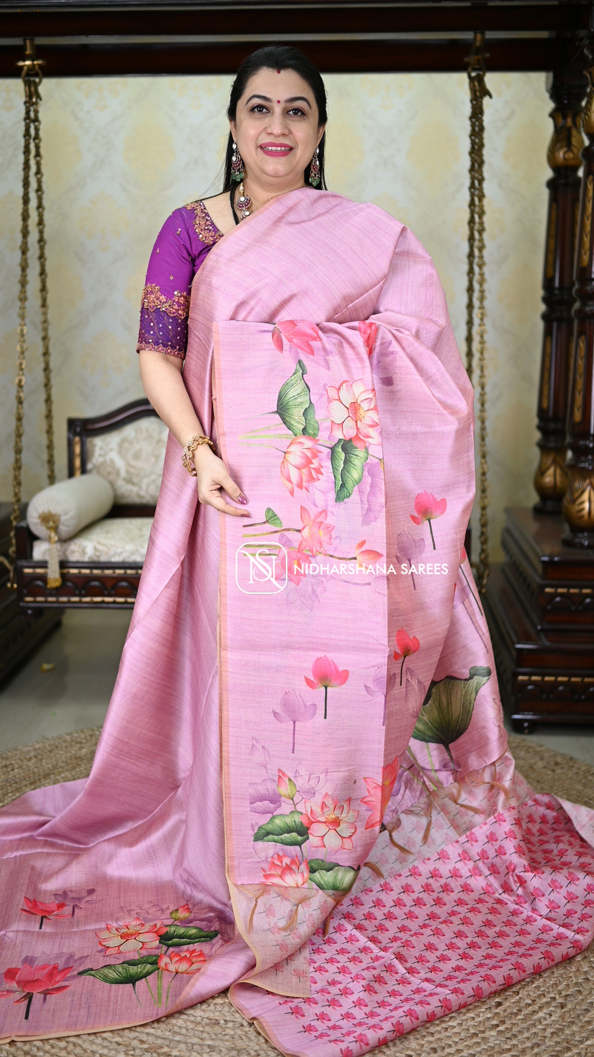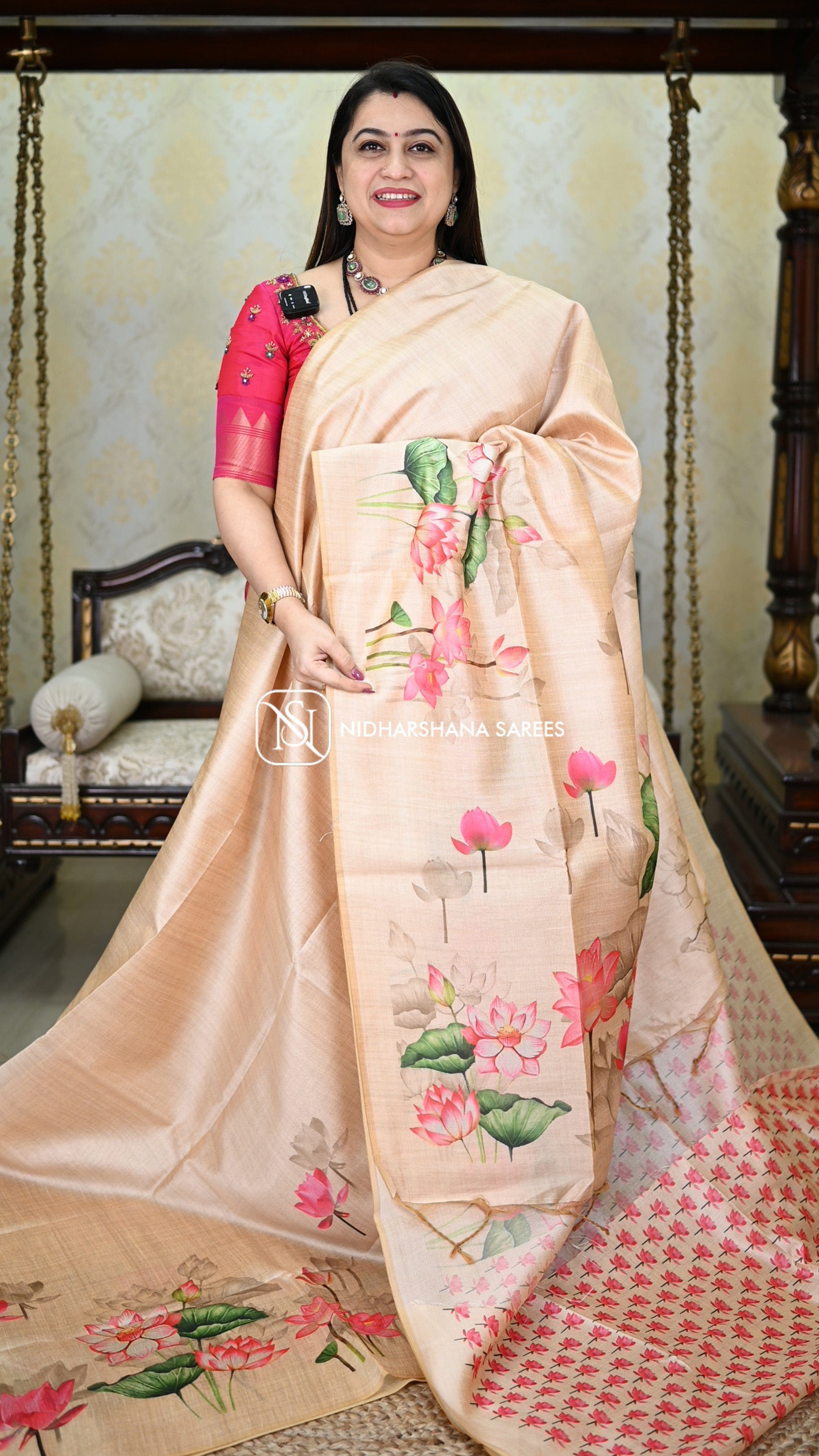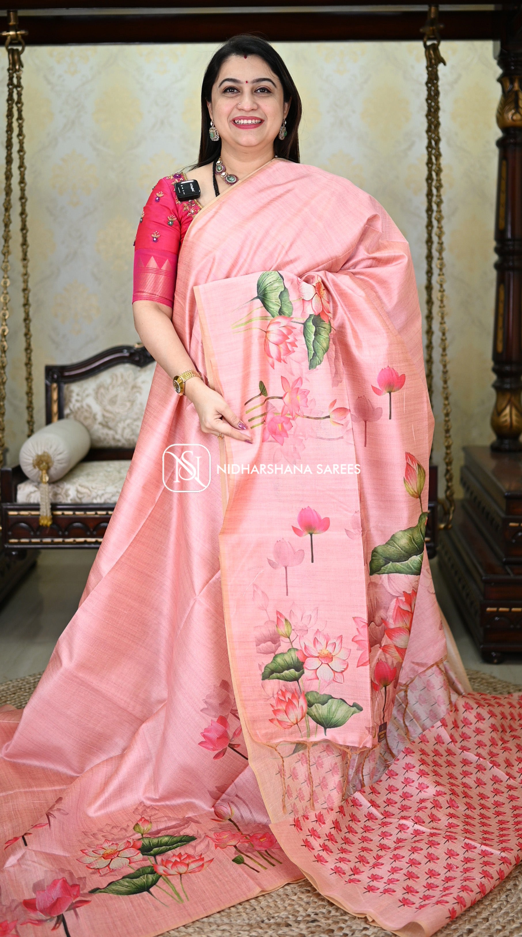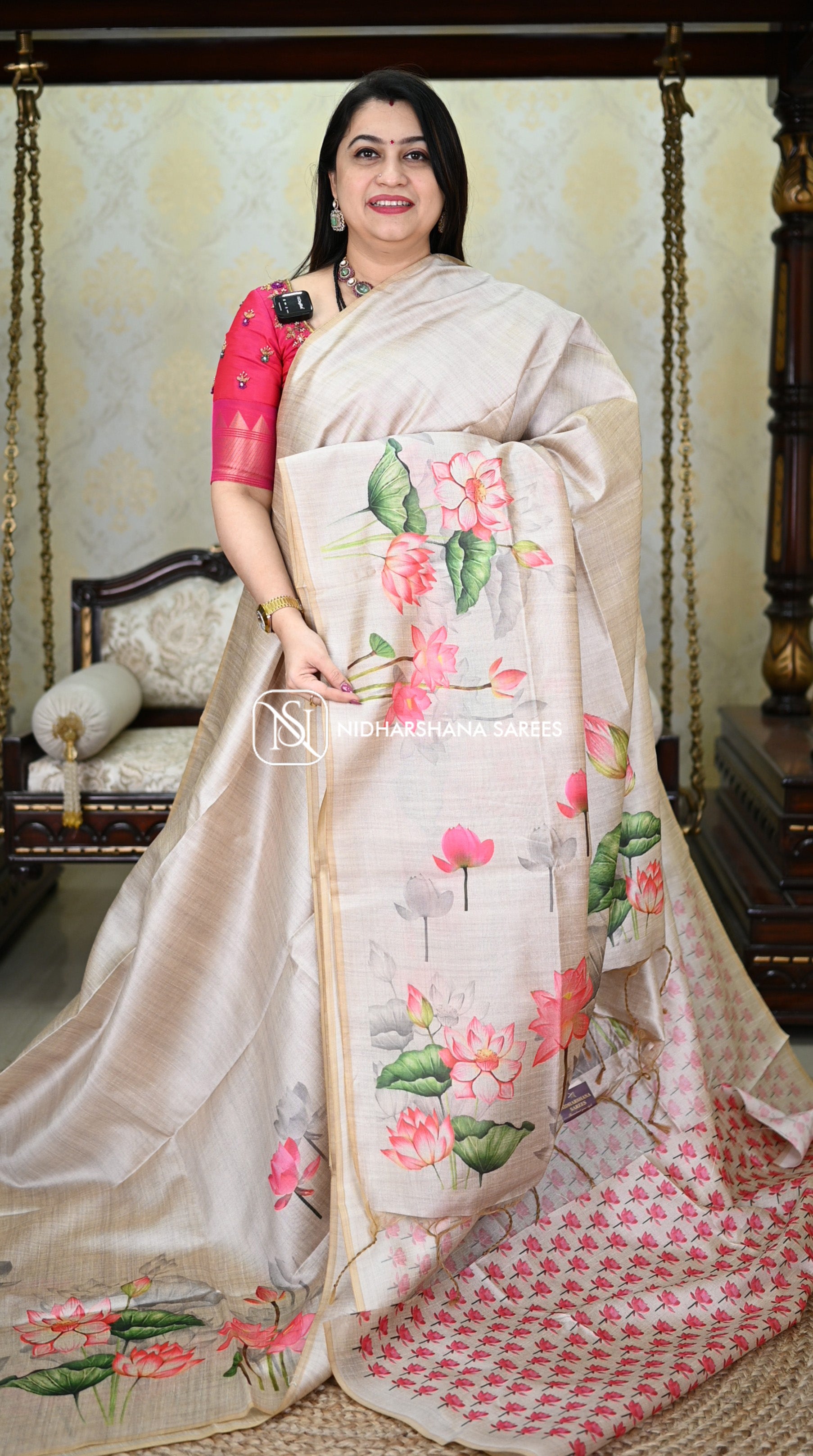This Kosa silk having pichwai concept and digital prints on the lower side of the border and upper side will not be having border and the pallu part is carrying lotus print on all over the pallu with attached tassels. and the floral prints on the blouse part.