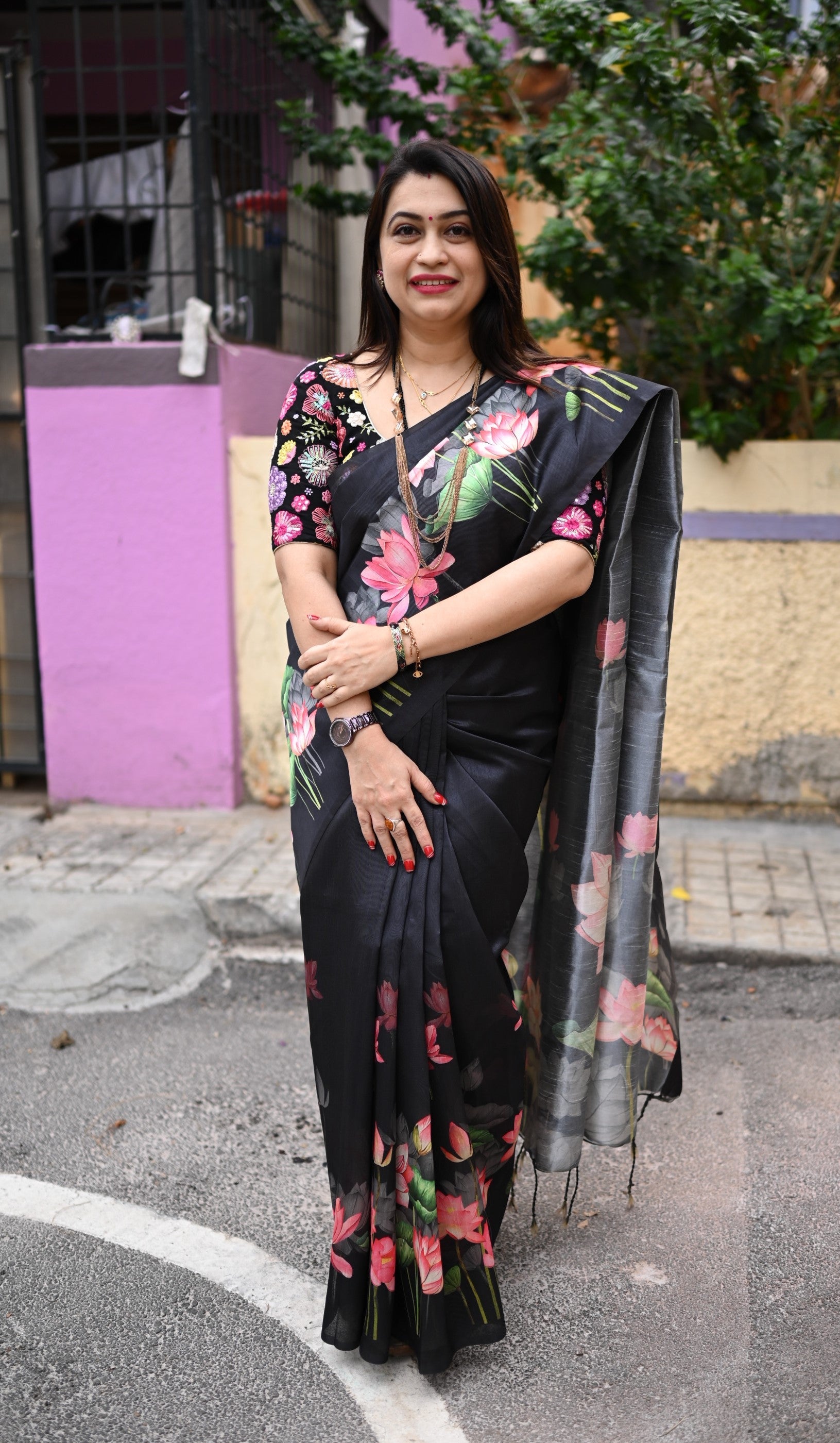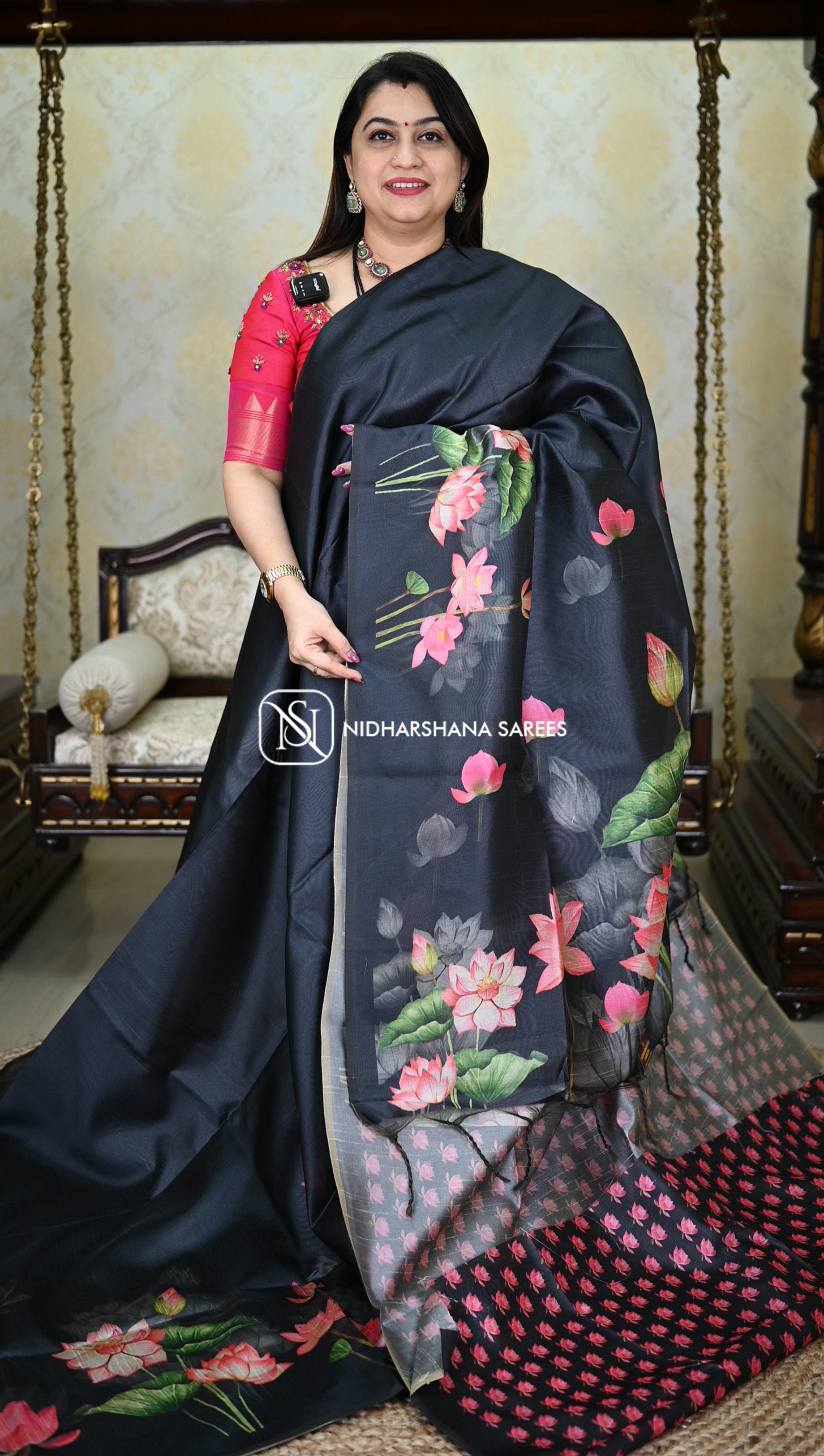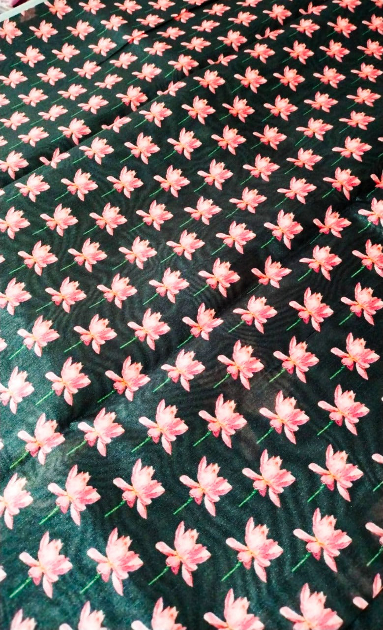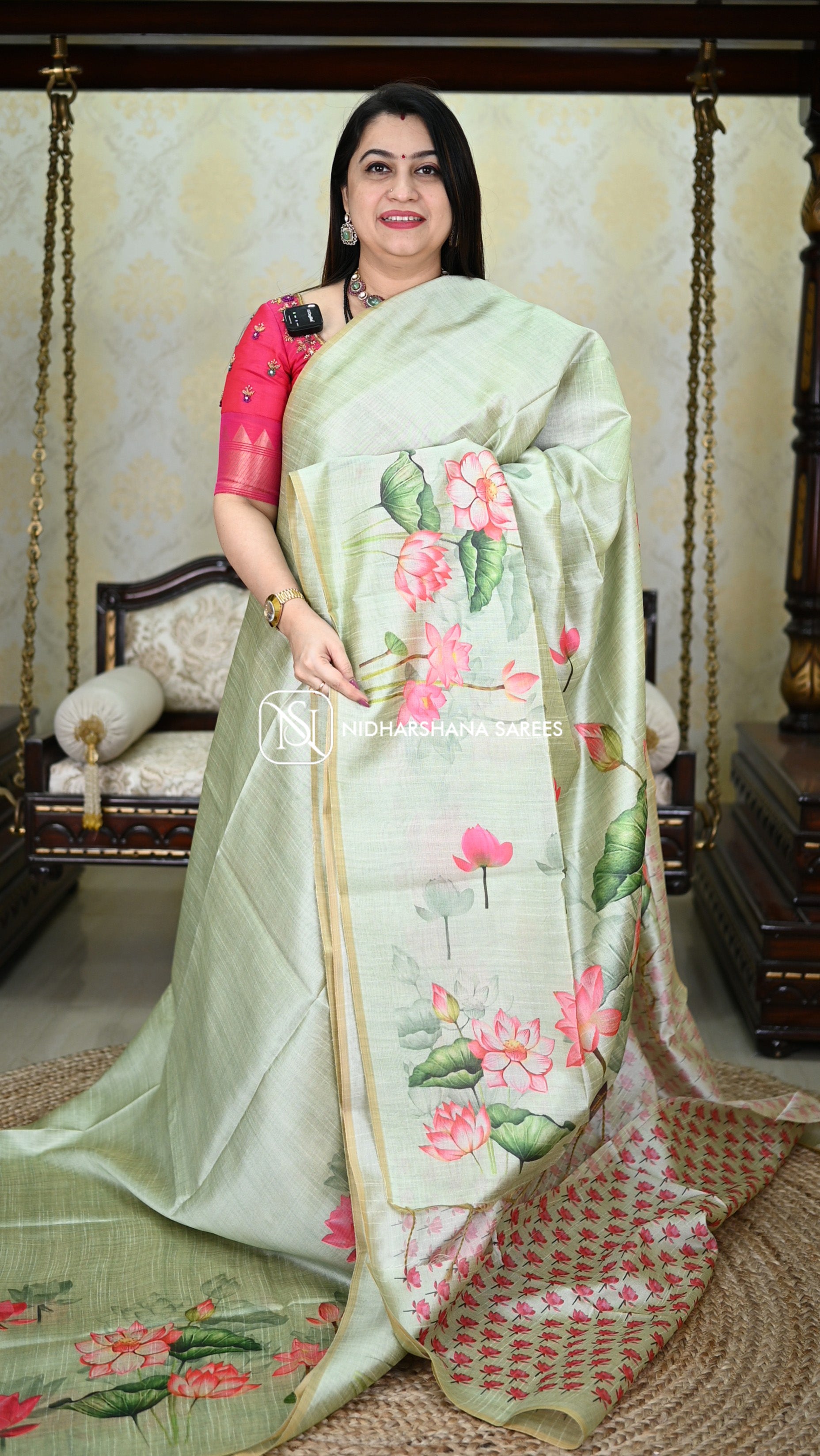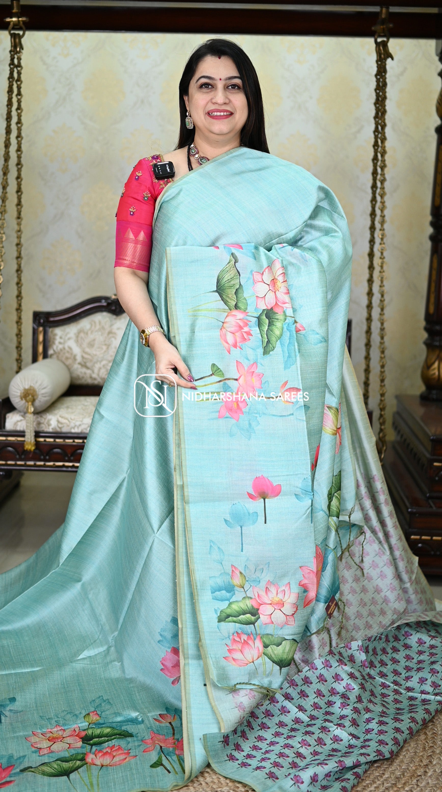 This Kosa silk having pichwai concept and digital prints on the lower side of the border and upper side will not be having border and the pallu part is carrying lotus print on all over the pallu with attached tassels. and the floral prints on the blouse part.