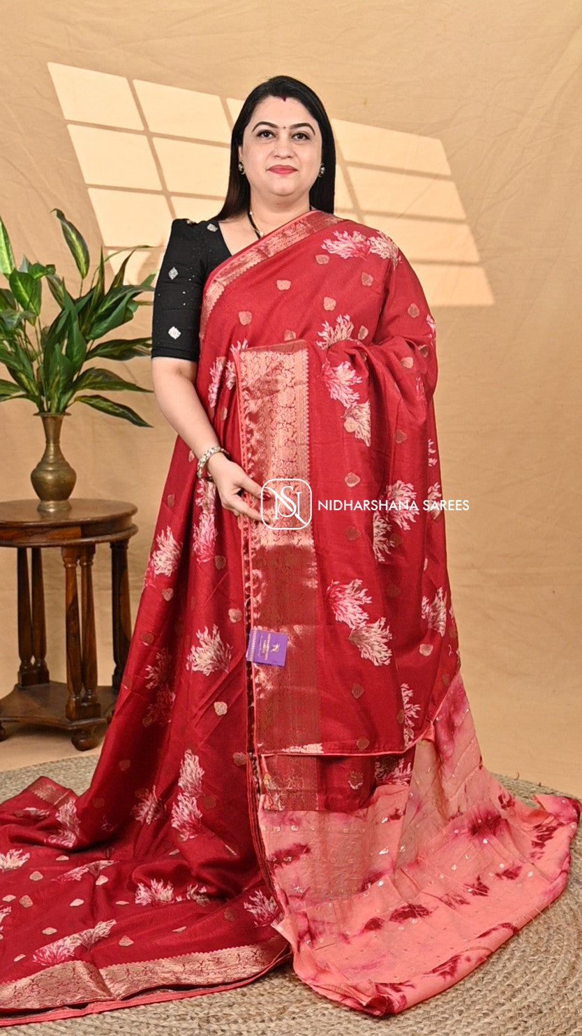 This Semi Dola saree features delicate zari butta work that adds a refined shimmer to its fabric, perfectly complemented by elegant floral digital prints. Combining traditional craftsmanship with modern design, it offers a graceful drape and a sophisticated look ideal for festive occasions and formal events. The interplay of zari embellishments and digital florals ensures a distinctive aesthetic that enhances your presence with subtle opulence.
