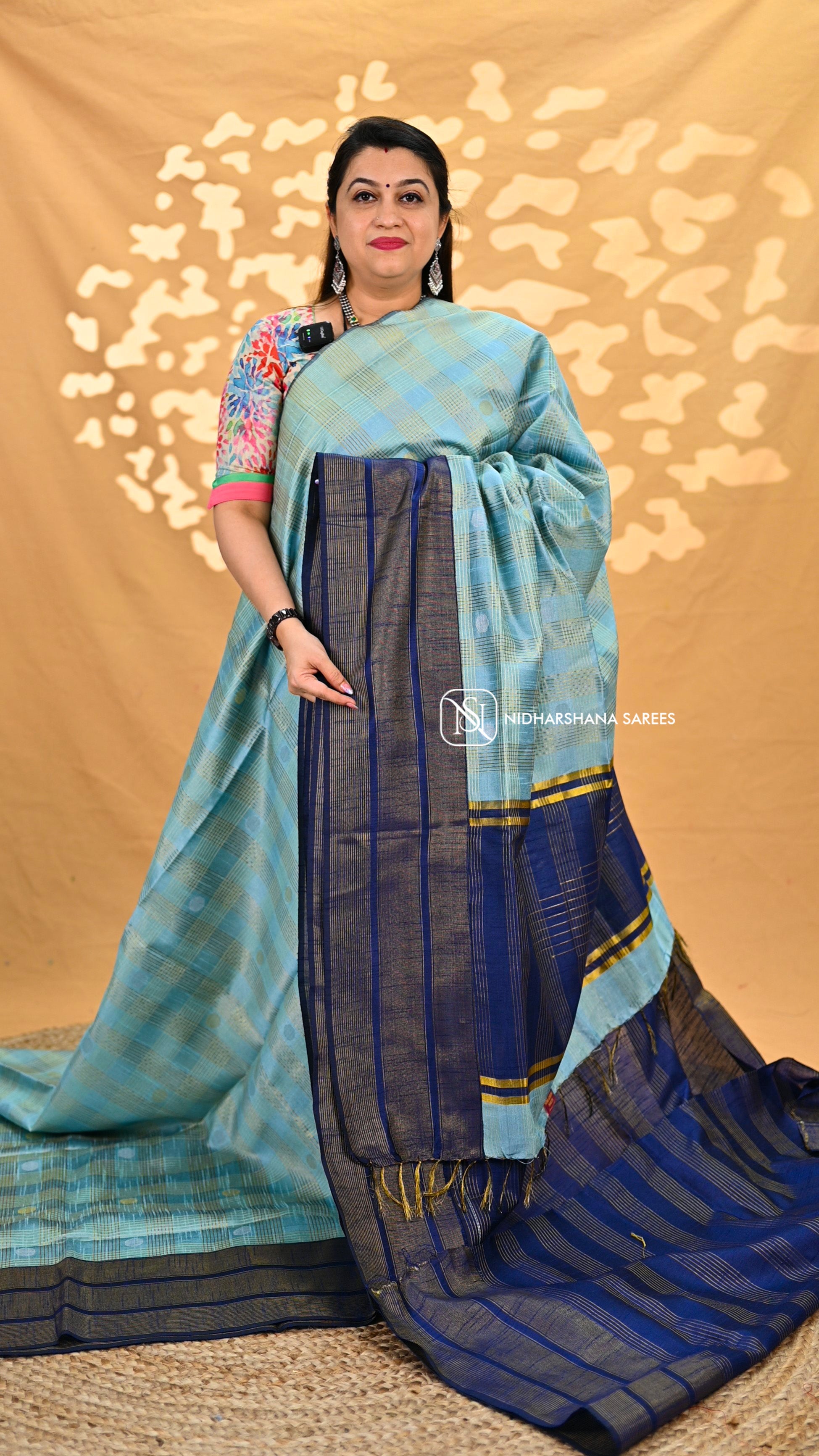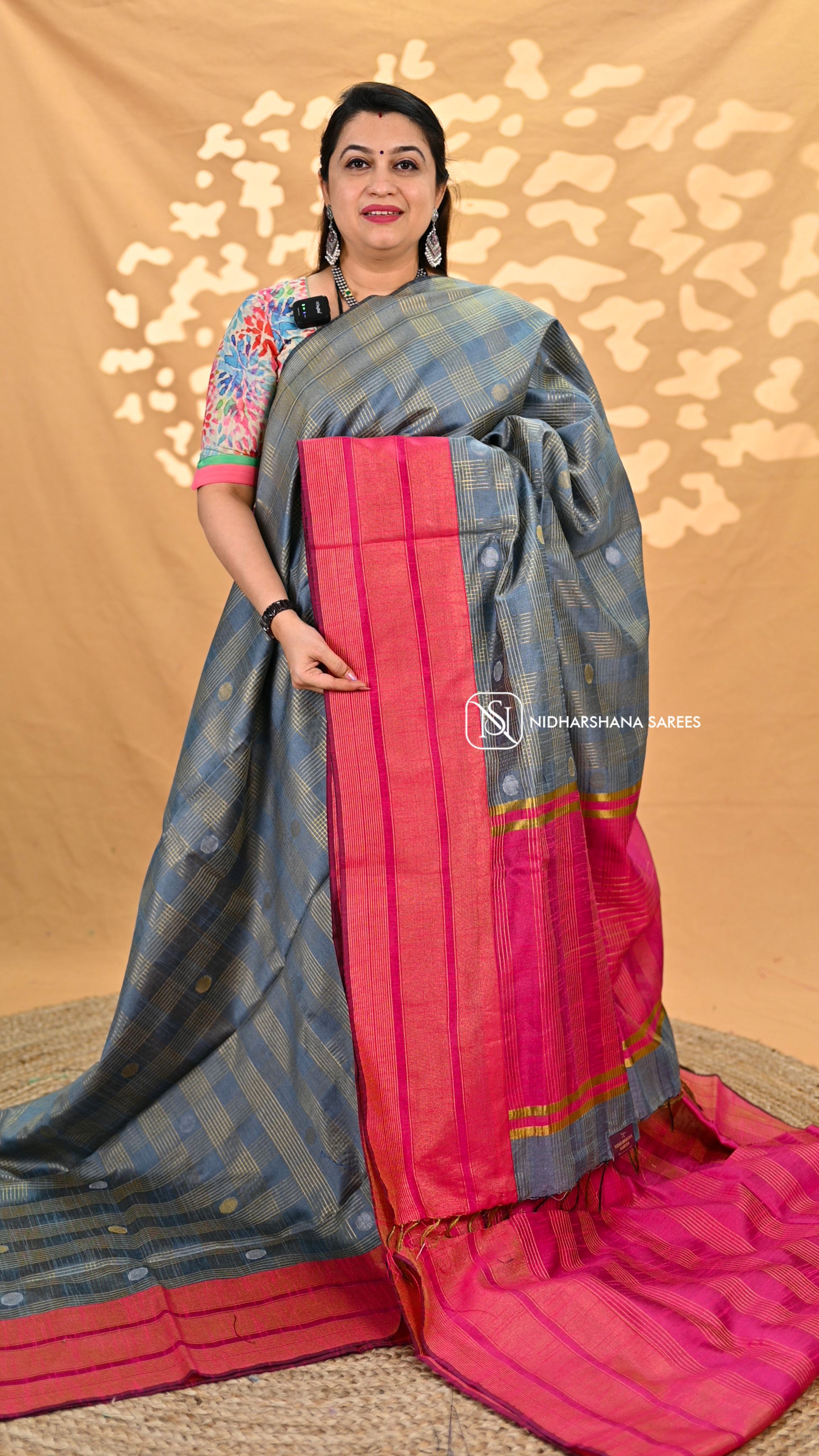 Experience the luxurious softness and captivating shine of this semi-raw silk fabric adorned with a stunning silver zari butta design. Crafted with high-quality materials, this fabric is perfect for adding a touch of elegance to any outfit or for formal occasions. The entire body features a beautiful zari checks pattern, enhanced by silver and copper coin butta and big border accents, and is finished with a contrasting pallu and blouse piece for a timeless and sophisticated look.