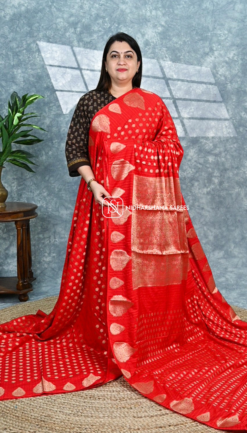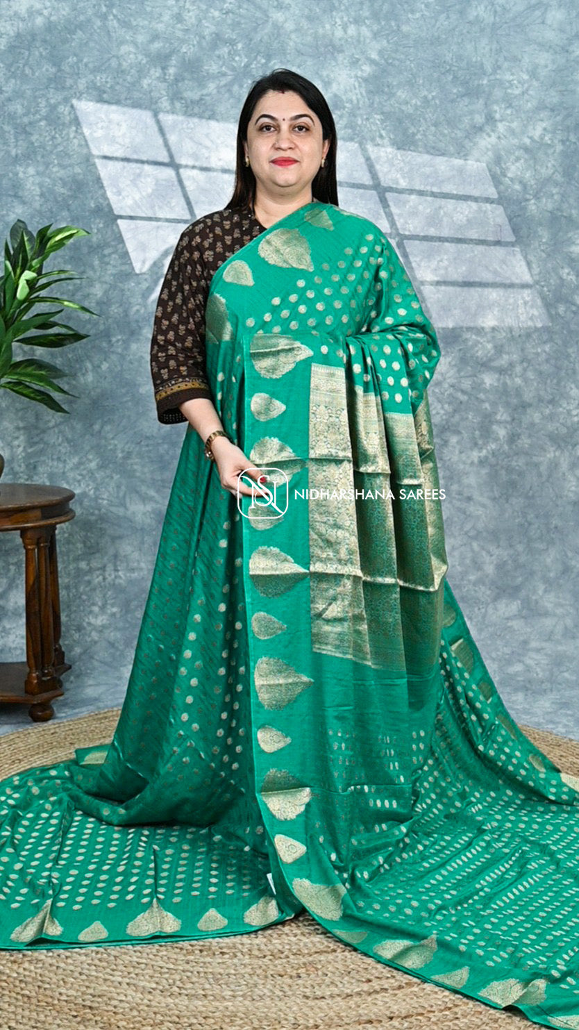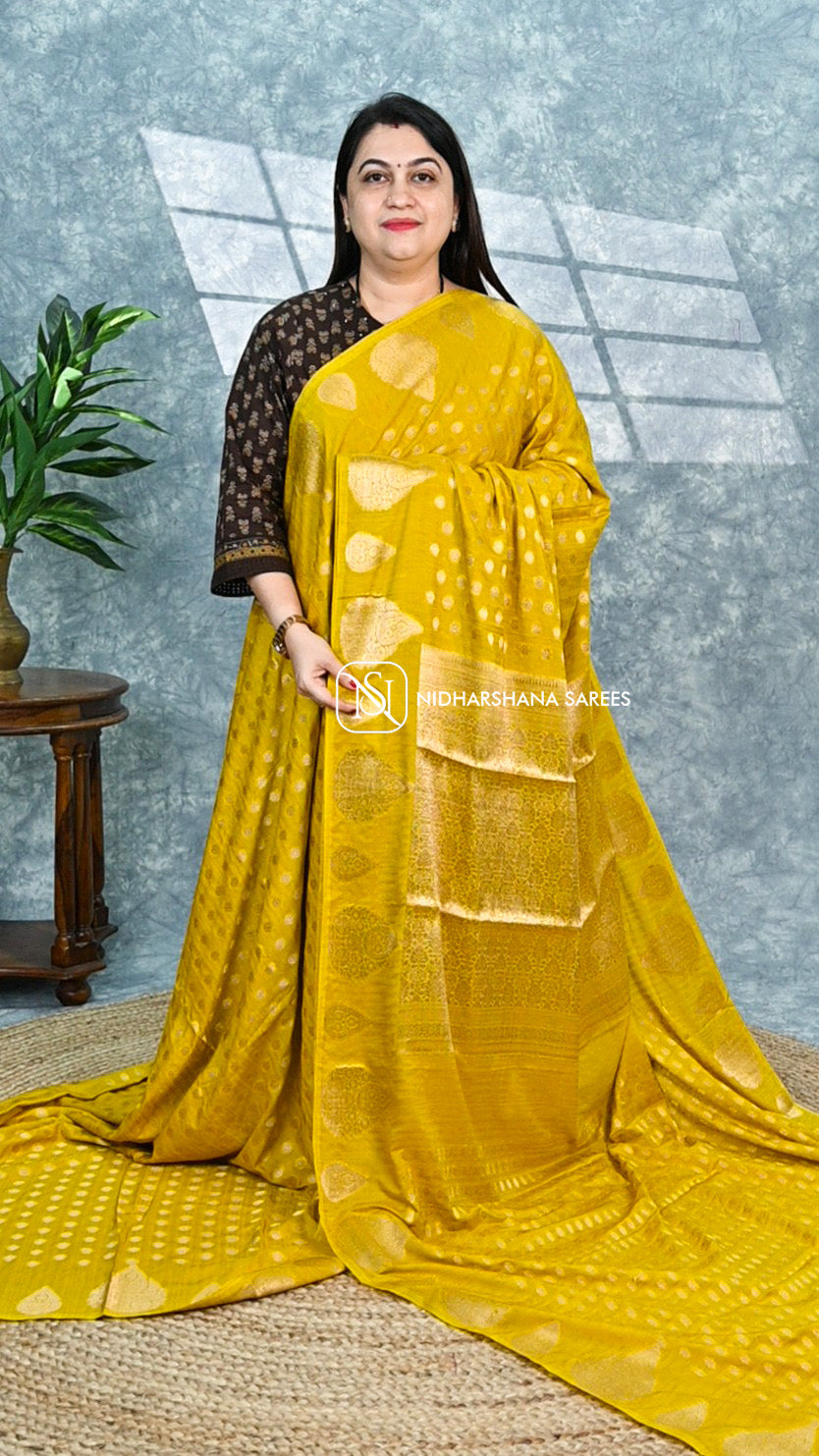 Experience the elegance of our Tussar Georgette fabric, featuring a luxurious blend of lightweight tussar silk and soft georgette. Enhanced with intricate gold weaving butta, this material offers a rich texture and subtle shimmer, perfect for sophisticated apparel and traditional wear. Its breathable and delicate feel ensures comfort while showcasing exquisite craftsmanship, ideal for those seeking a refined and timeless look.