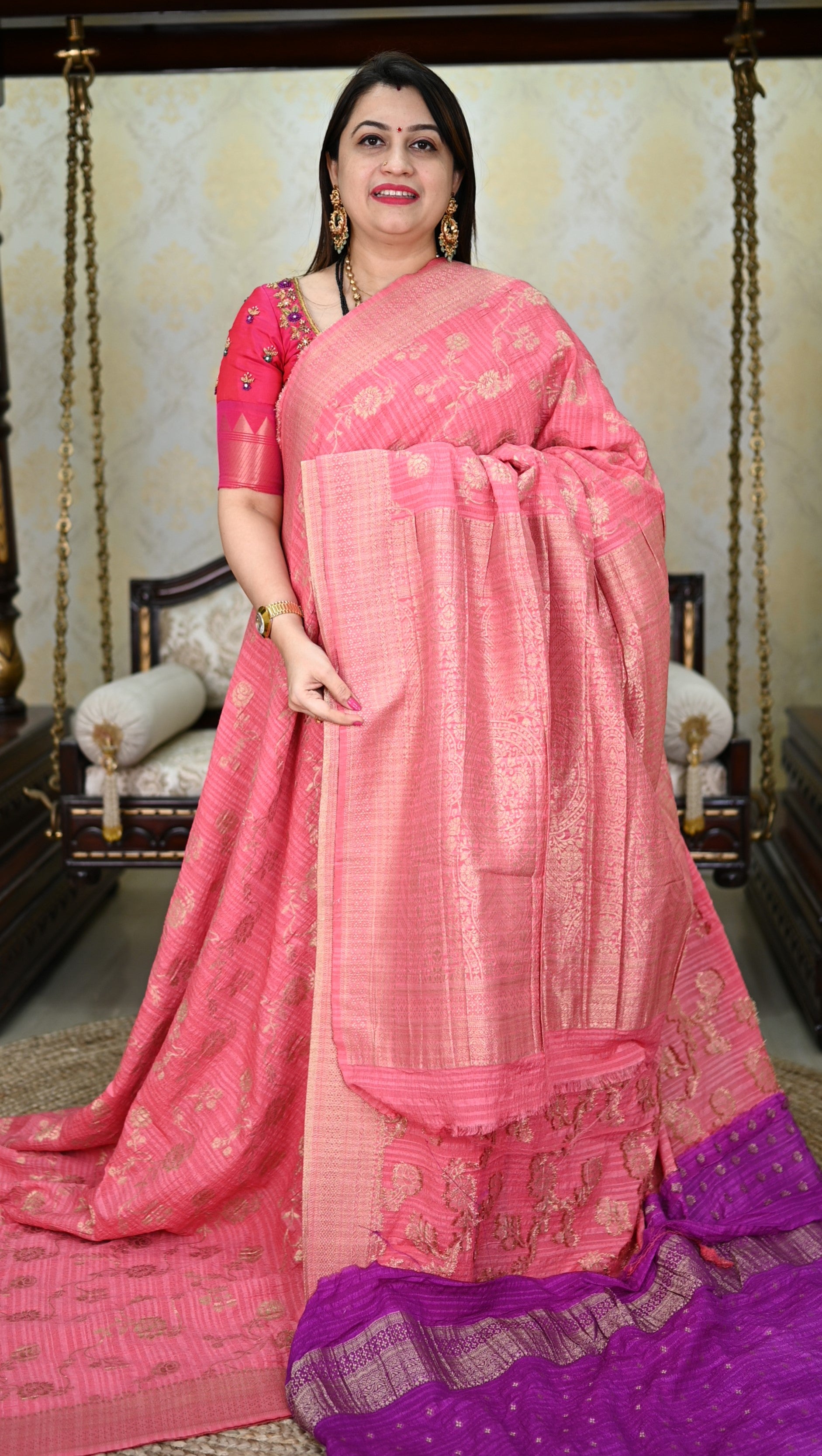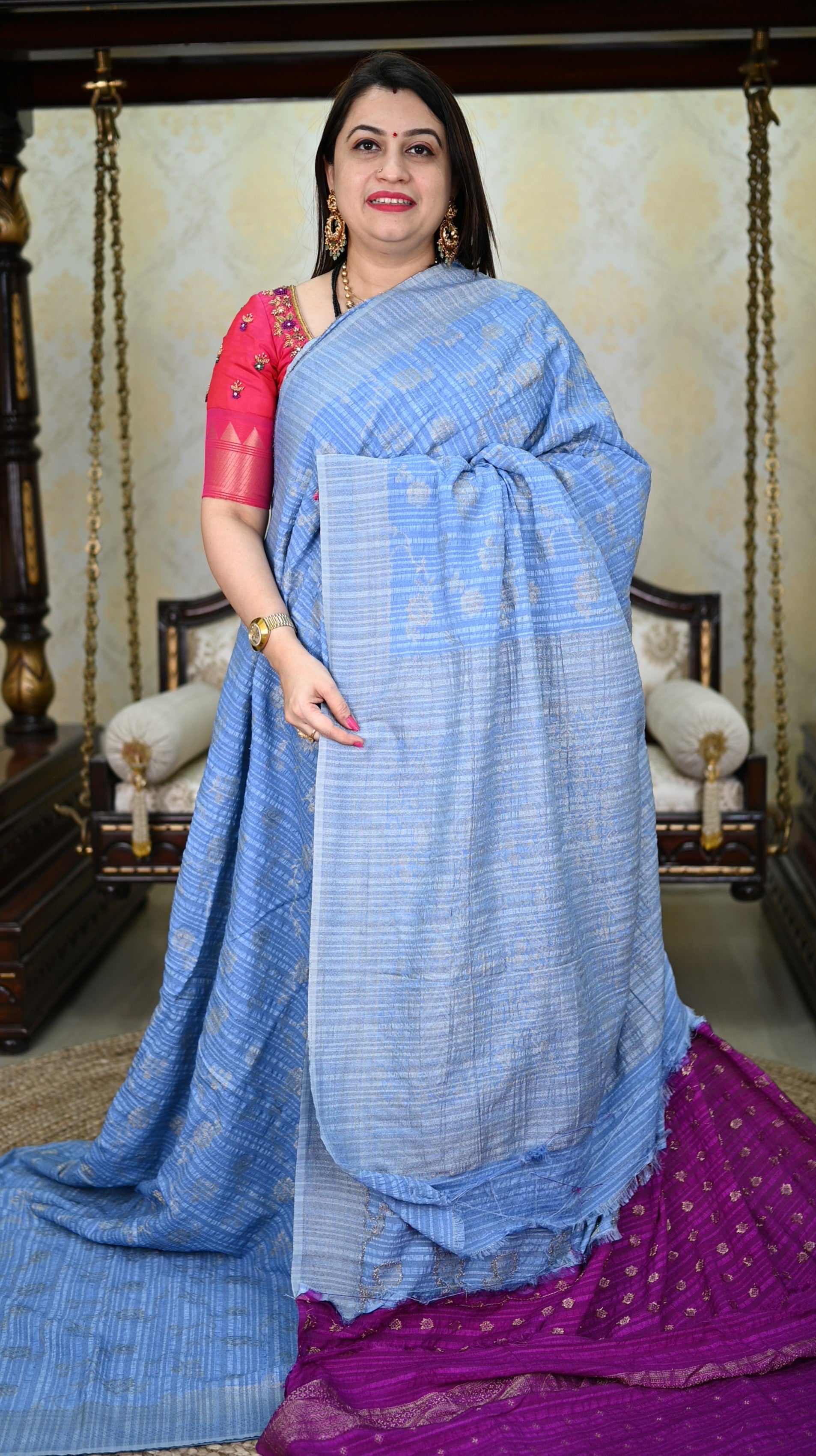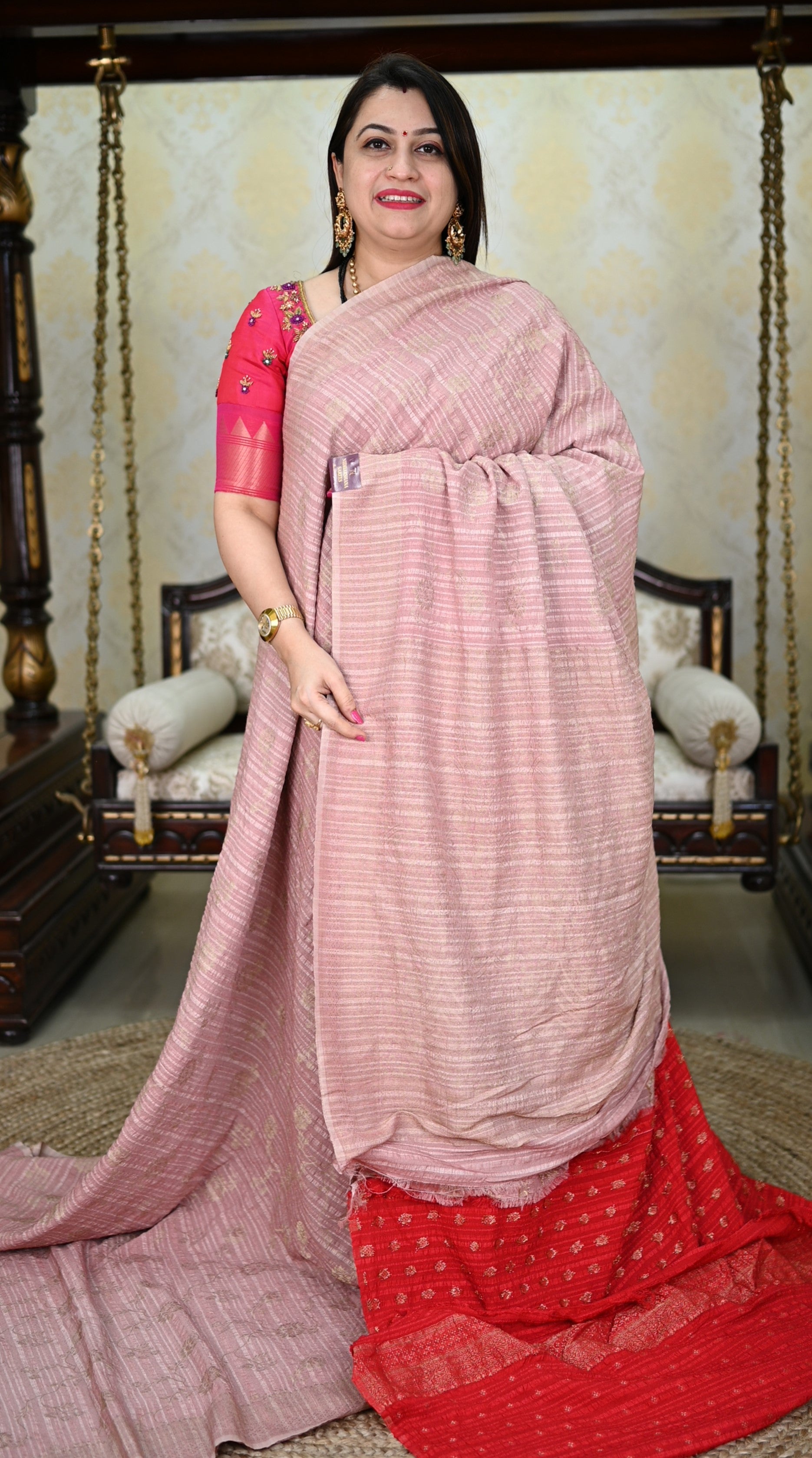 Tussar by georgette combines the rich texture of Tussar silk with the lightweight, flowing quality of georgette. This blend creates a luxurious fabric that drapes beautifully, making it ideal for sarees, suits, and ethnic wear. The result is a soft, comfortable fabric with a unique sheen and a slightly crinkled finish.