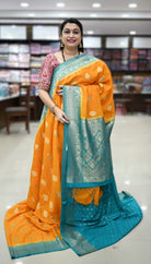 Georgette Tussar shttps://admin.shopify.com/store/nidharshana/products/9482018128183arees are known for their elegant appeal and luxurious feel. They typically blend the softness of georgette with the rich texture of Tussar silk, resulting in a fabric that drapes beautifully and exudes sophistication.