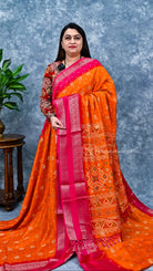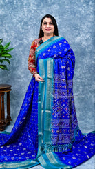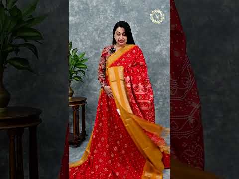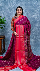 Semi Dola saree featuring intricate bandhini print combined with elegant peacock motif detailing on the body. This traditional weave showcases the timeless appeal of tie-and-dye craftsmanship paired with symbolic peacock designs, creating a sophisticated blend of classic and contemporary aesthetics. Perfect for festive occasions and celebrations, the semi dola fabric offers a graceful drape with subtle texture. An ideal choice for those seeking authentic Indian ethnic wear with refined artisanal detailing.