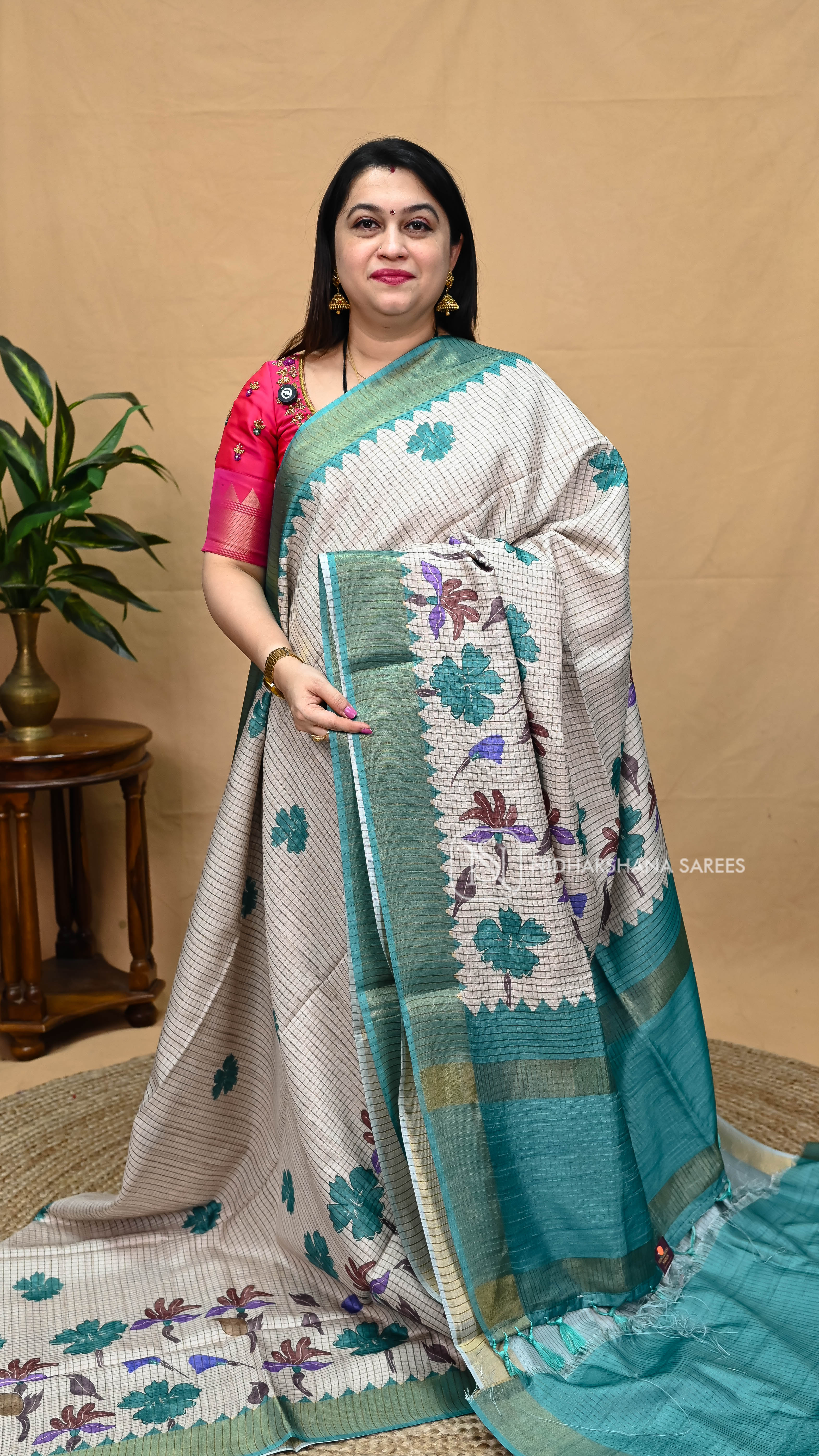 Semi Tussar With Mini Checks And Floral Digital Print