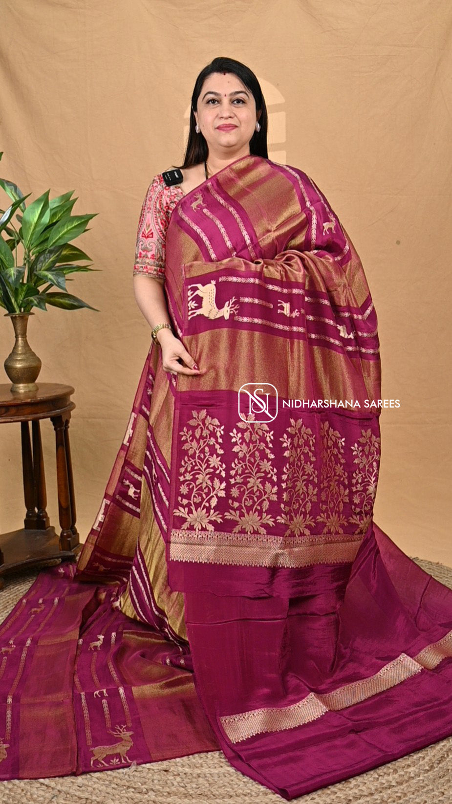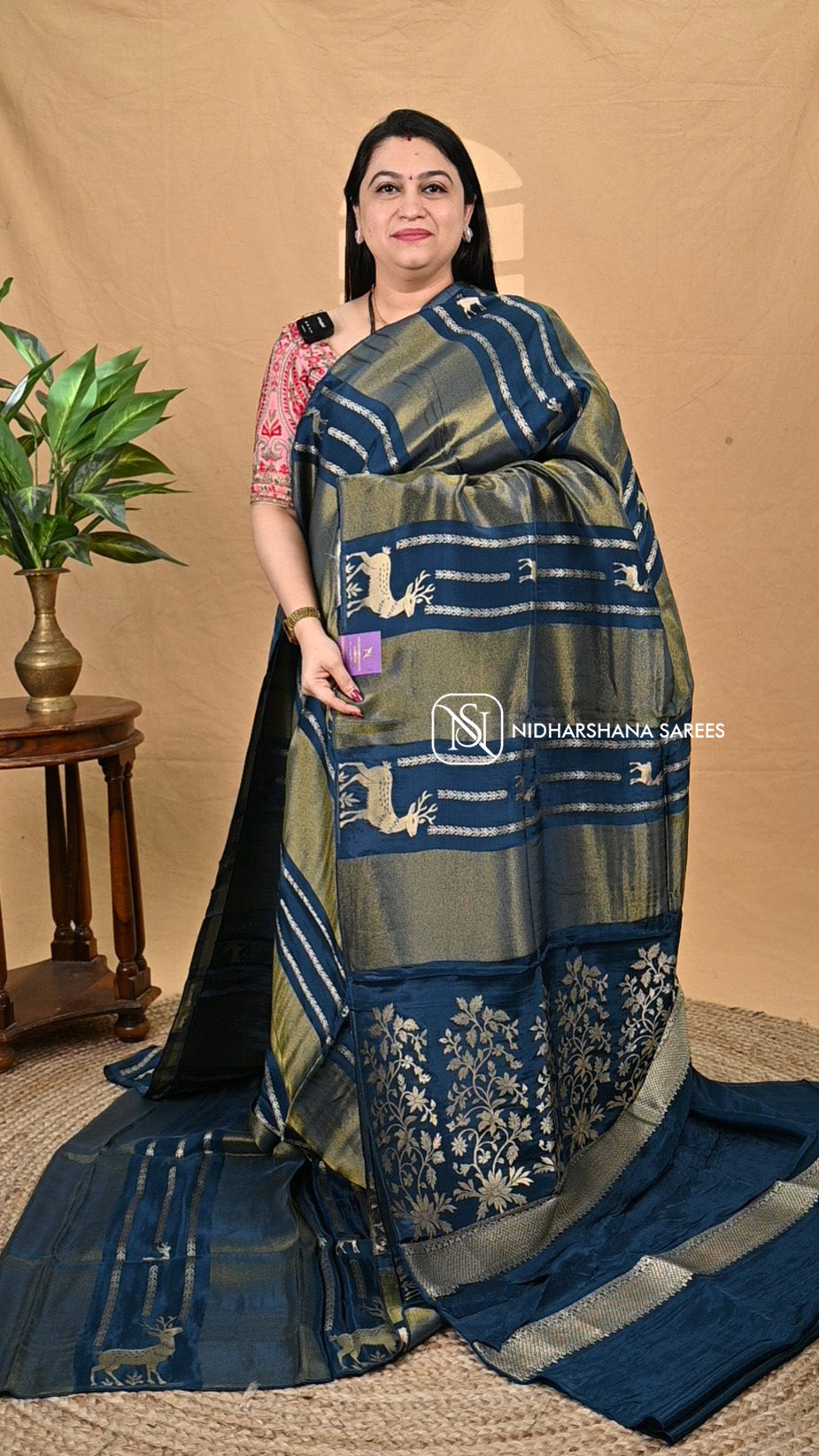 Mashru Satin represents a refined fusion of traditional weaving and contemporary design. This luxurious fabric showcases an exquisite deer motif that brings an element of grace and sophistication to your wardrobe. The satin finish delivers a lustrous sheen with a smooth, fluid drape that enhances the elegance of any saree. Crafted with meticulous attention to detail, the deer concept symbolizes gentleness and poise, making this piece ideal for those who appreciate nuanced artistry. Perfect for festive occasions and special celebrations, this Mashru Satin combines heritage craftsmanship with timeless aesthetic appeal.