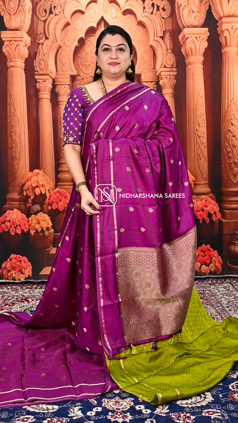 This Semi Tussar Silk saree features a delicate gap border paired with intricate zari butta work, blending traditional craftsmanship with refined elegance. The natural texture of tussar silk offers a subtle sheen and breathable comfort, making it ideal for both festive occasions and formal gatherings. The zari buttas add a touch of sophistication, enhancing its timeless appeal. Perfect for those who appreciate heritage textiles with a contemporary touch.
