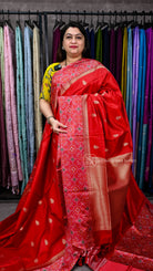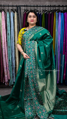 Silk Cotton With Patola Printed Border Experience the perfect blend of comfort and elegance with this silk cotton saree, expertly crafted to offer the best of both fabrics. The lustrous silk base provides a refined drape and subtle sheen, while the cotton component ensures breathability and ease of wear throughout the day. The striking Patola printed border elevates the design with its intricate geometric patterns, a hallmark of traditional Indian textile artistry.